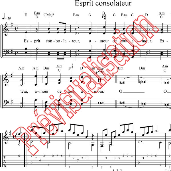 Description of each version :01 PDF: Song in French (4 voices)02 PDF guitare: Chords, tabs, 1 accompaniment03 PDF soliste(s): Solos in FR, EN, DE, IT, ESThème : Esprit-SaintUsage : Chant de TaizéCritères liturgiques : Ostinato à versetsRéf dans le recueil : 810Réf CD : T 569Année d'édition : 2000Format :Fichier PDF Taille : 245Ko en 8 fichiers