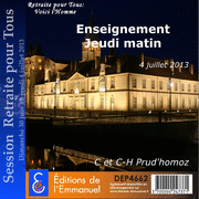 Retraite pour tous : Voici l'homme (Jean 19, 5) - du 30 juin au 4 juillet 2013 Enseignement Enregistré le 4 juillet 2013 Depuis 1975, lors des Sessions d'été de Paray-le-Monial, la Communauté de l'Emmanuel se met au service de tous ceux qui désirent faire cette expérience du Coeur. Aujourd'hui encore, le Coeur de Jésus veut manifester sa miséricorde à tous les hommes. Info Sessions : 03 85 81 56 00 par internet : www.emmanuel.infoIntervenant(s) : Charles-Henry et Caroline Prud'Homoz, Format :MP3 64Kbps Mono Taille : 26.8Mo Durée : 58:35 mn d'écoute